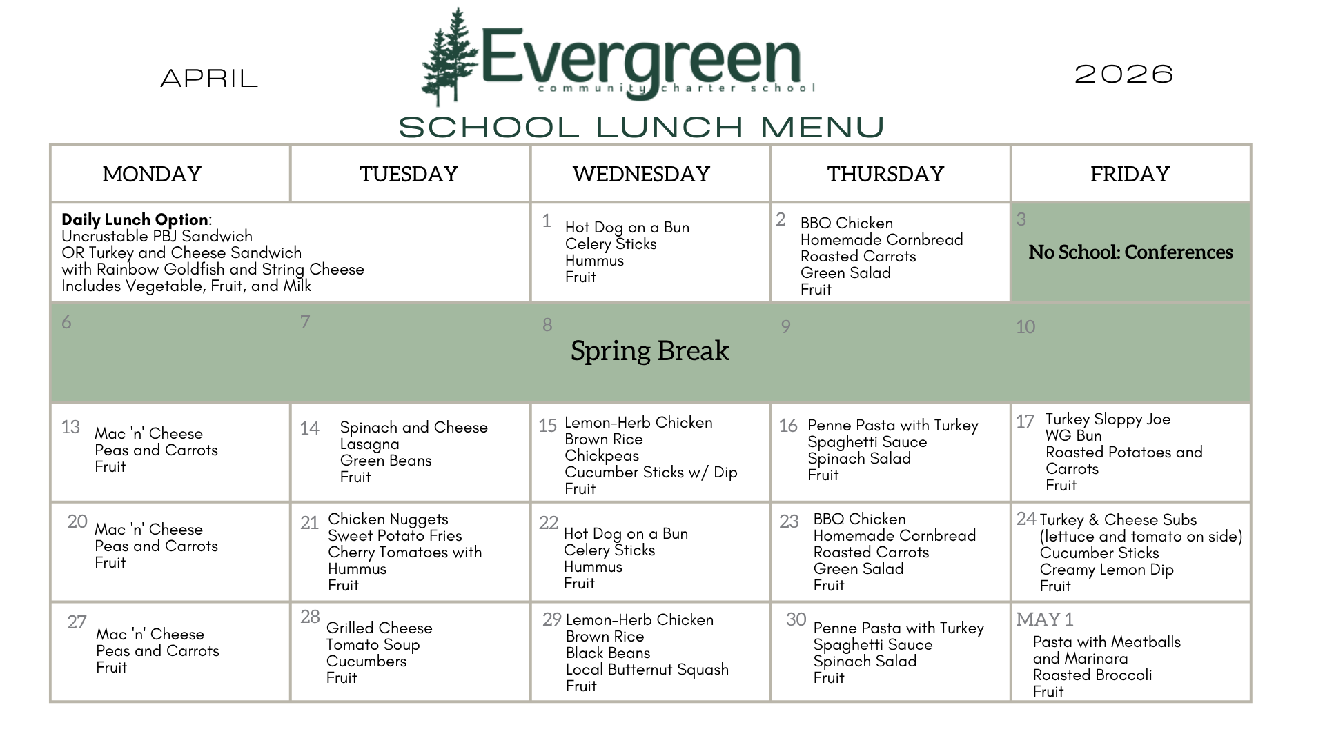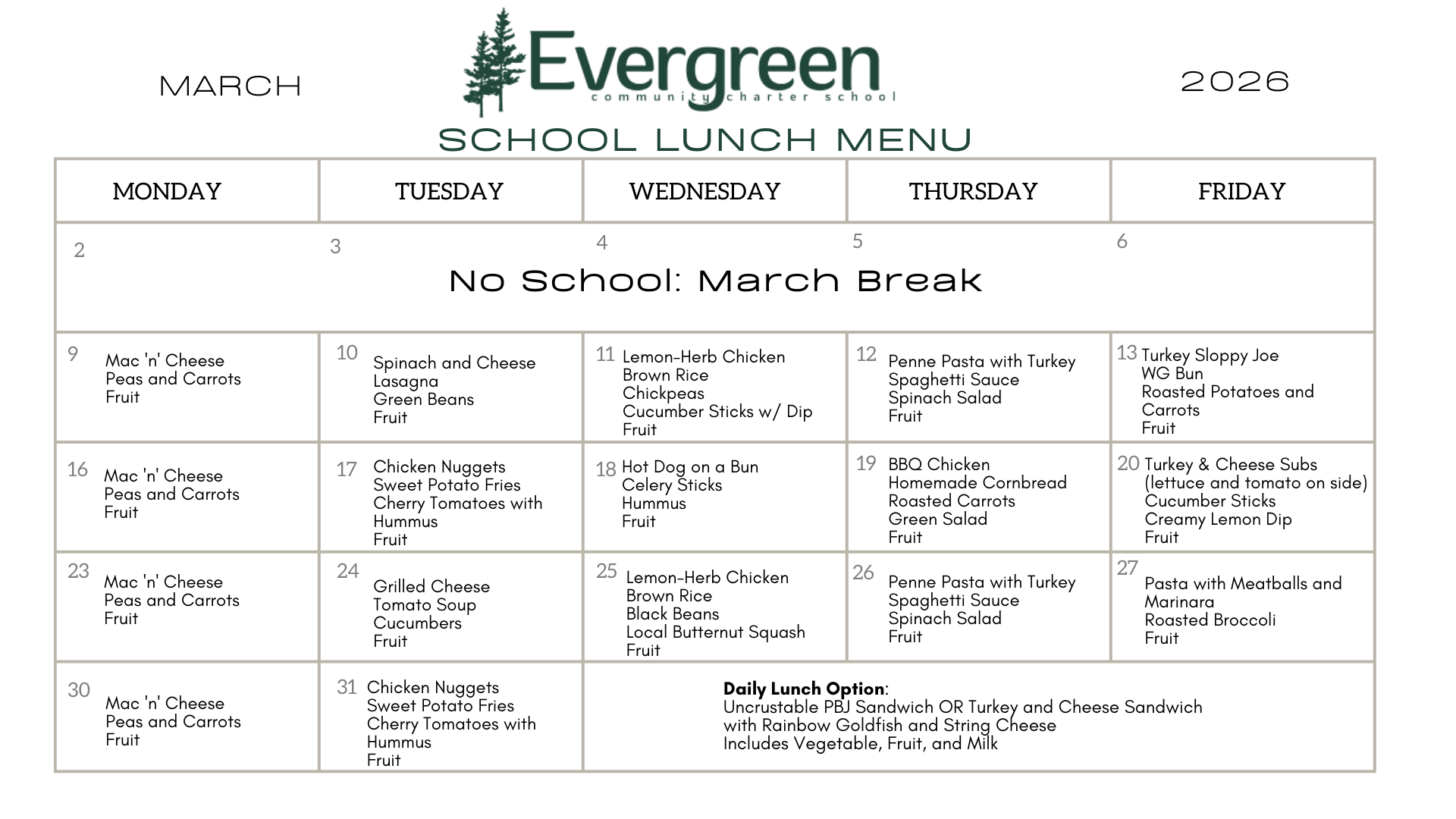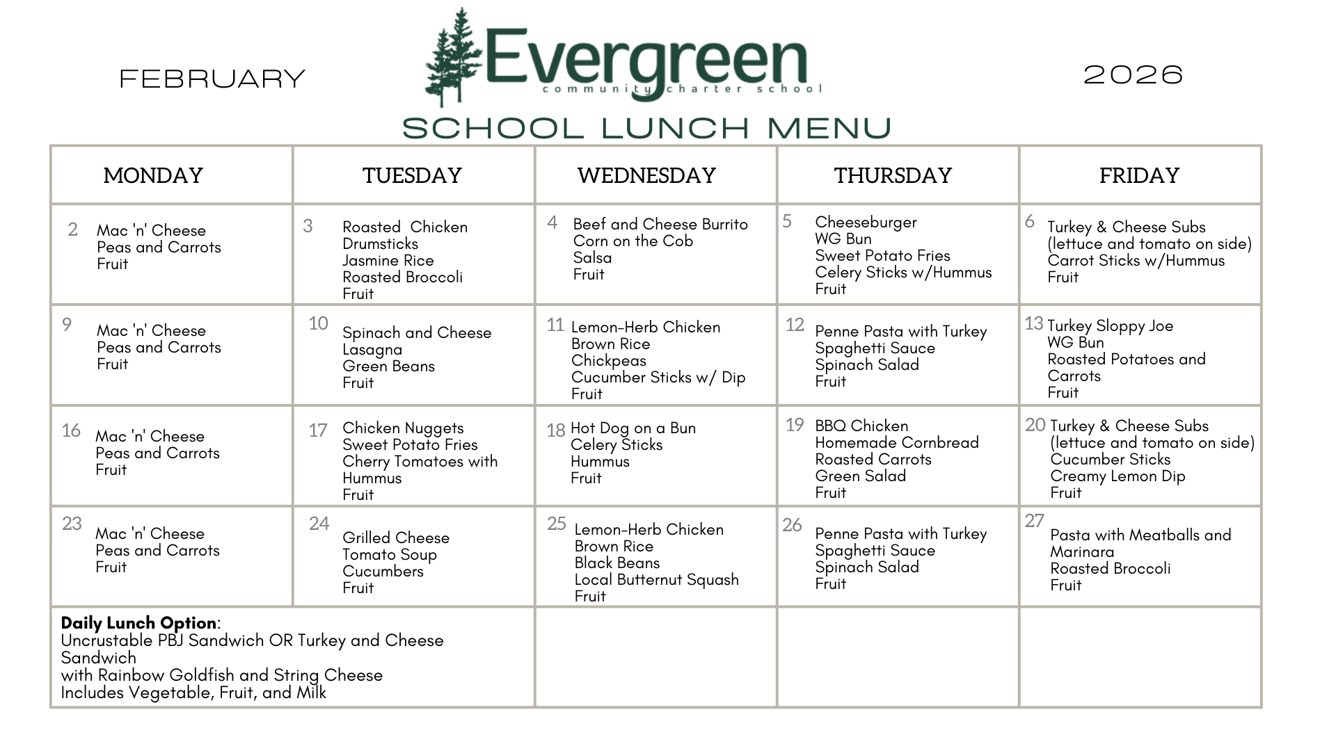 Evergreen offers a hot lunch program through our catering partner, Each One Teach One Through Food.