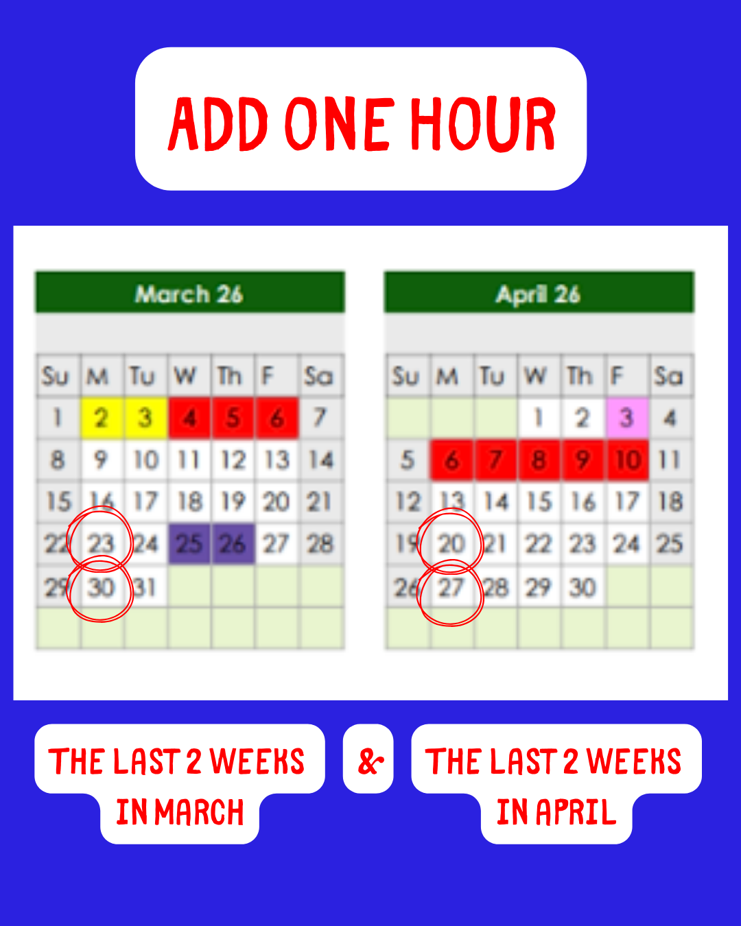 We have just under 4 hours to make up due to weather related closings/delays. We are scheduling the snow makeup times by adding an hour for several Mondays.