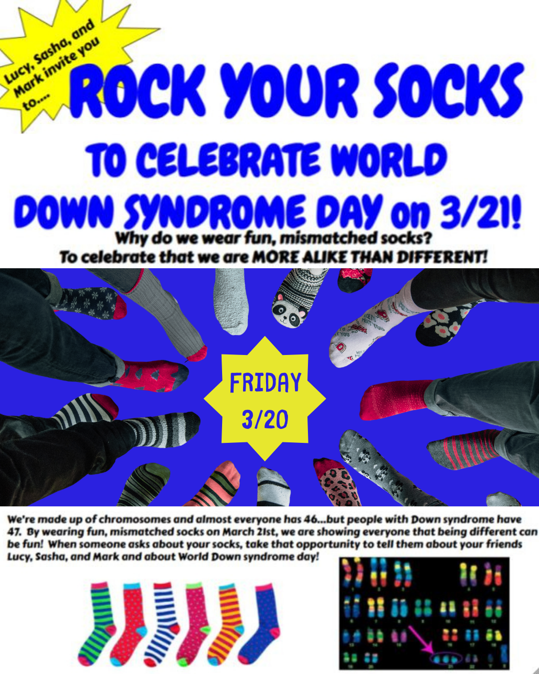 World Down Syndrome Awareness Day fall on a Saturday this year, so to celebrate with Mark, Lucy, and Sasha, we invite you to wear your mismatch socks to school on Friday, March 20th!
